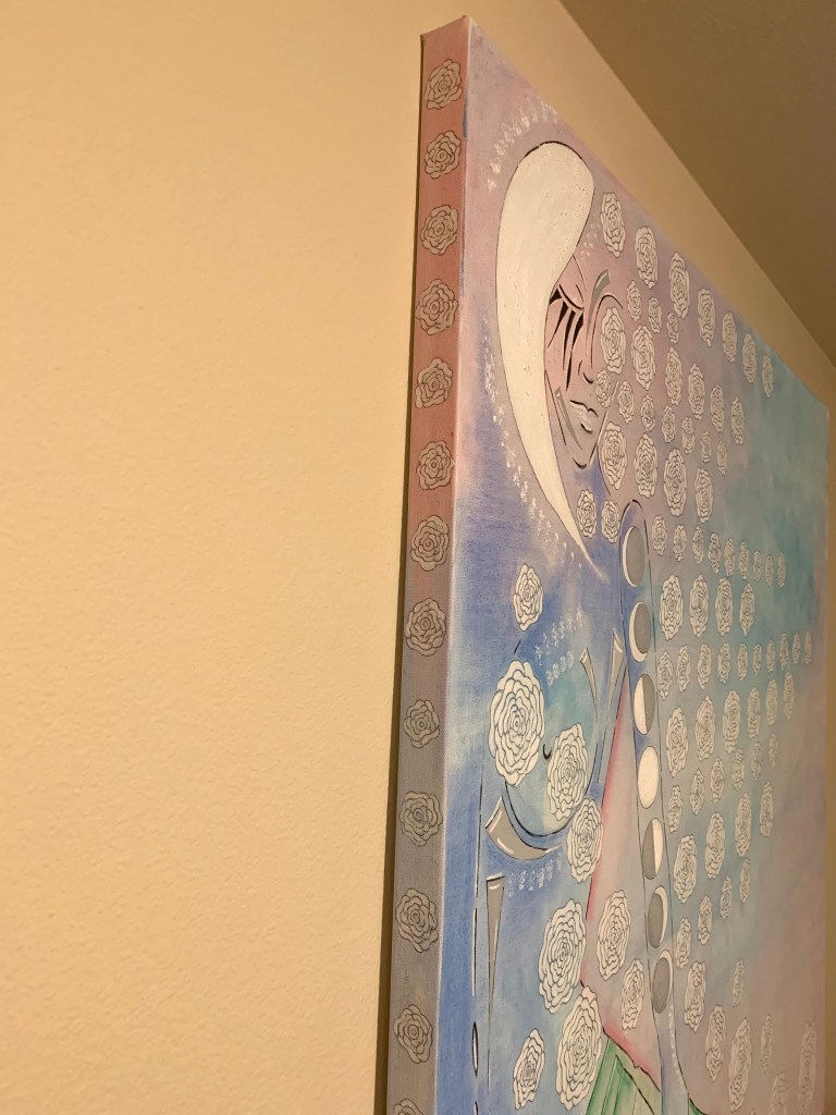 Still processing my trial. Did not get up at 5am. Found 30 minutes to work on Alessandra. Worked on painting roses down the side edges. This is new for me, but I really like the look. I will include a photo in this post. When I originally started the idea for this painting I used pastels, but used them too heavily and out of frustration took wet paper towel and tried to wash them off. The result was this washed out watercolor look across the canvas, that I loved. In my next attempt at Alessandra, I intentionally used the pastels with water and paper towel to create faded color blends across the canvas and to manipulate layers of soft color where I wanted to direct it. A new technique for me that I will continue to use. There must be lots of online art tips that I could grab that I am not simply discovering by accident. This is a thought I have kept in the back of my head ( to embrace some online education) that I have not yet embraced.