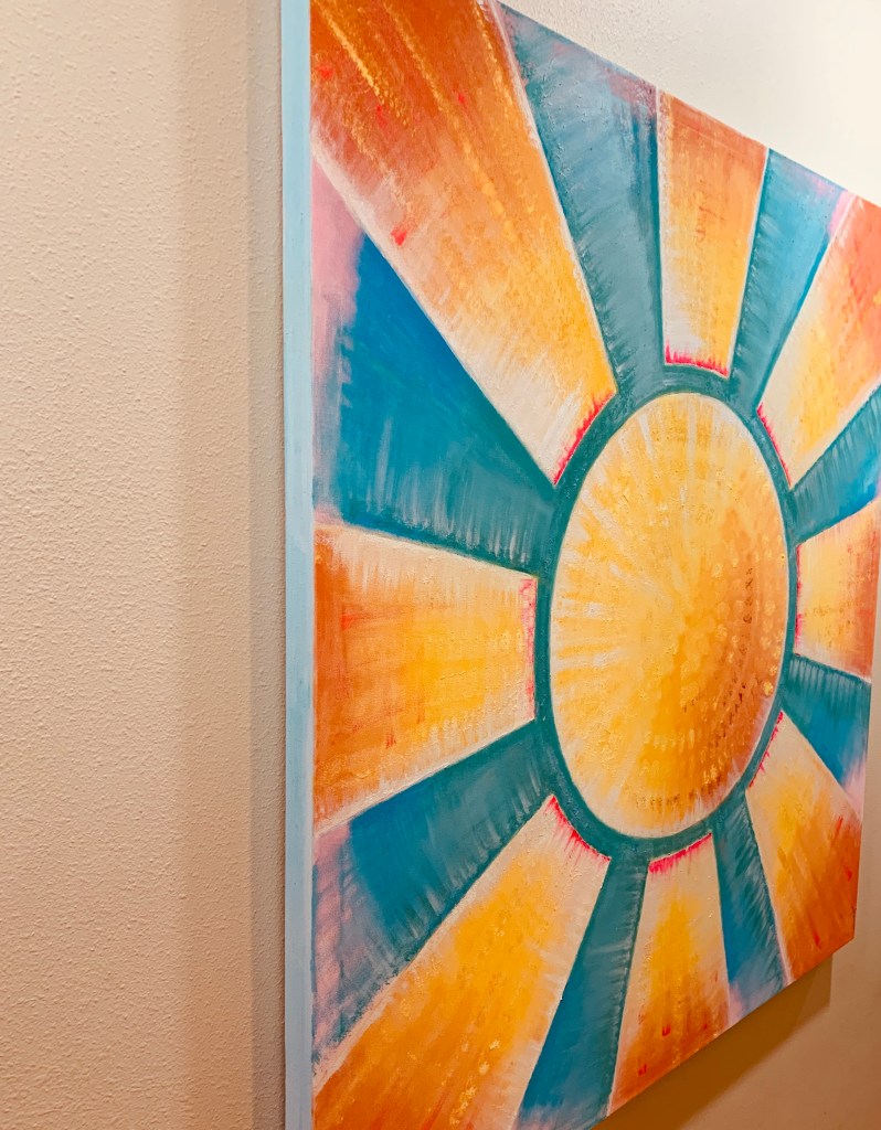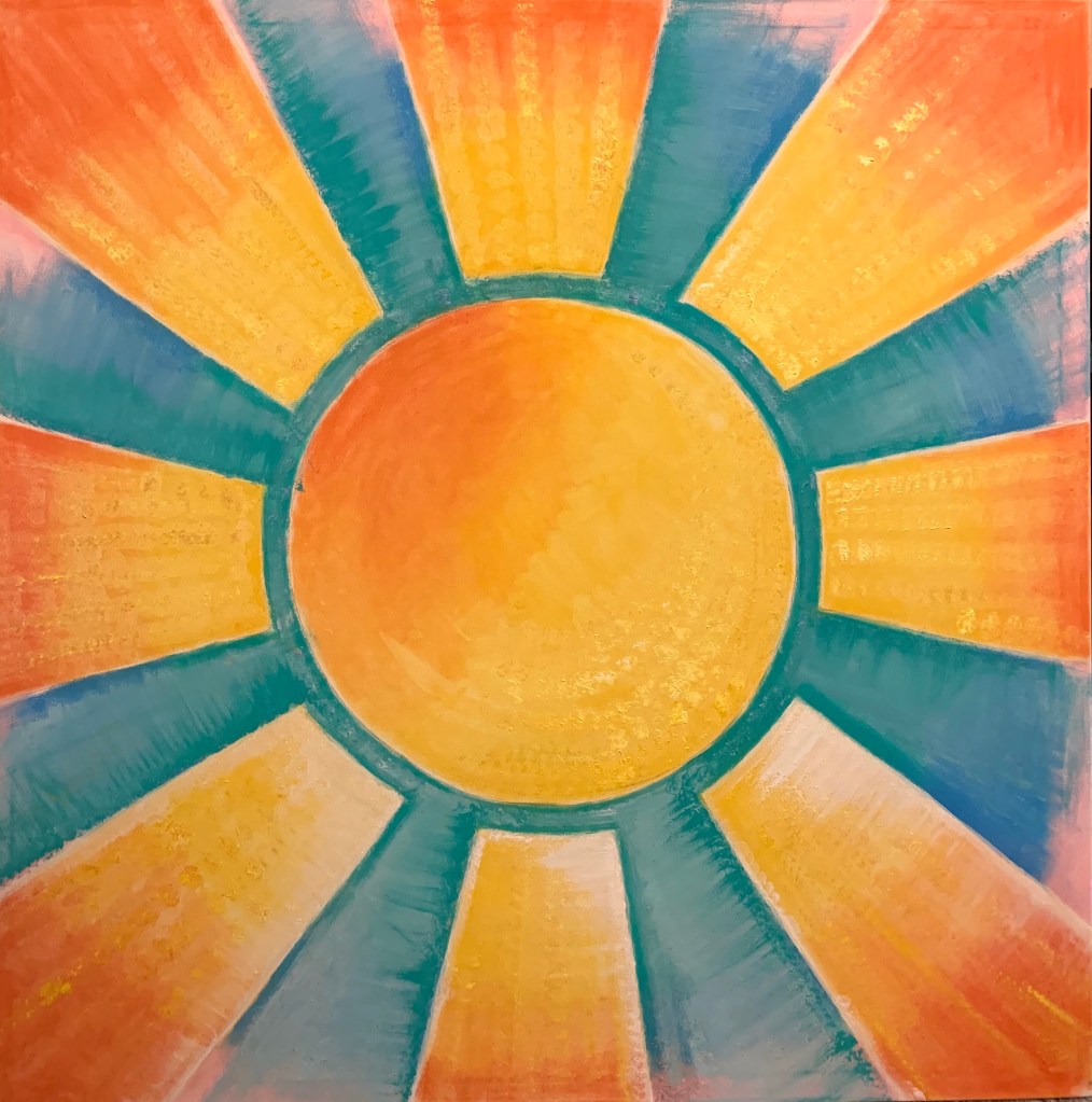I did not get up at 5am today. Maybe tomorrow. At times I incorporate my children into my art projects. I think this is important.. also a nudge. I am working on a sun, which I am naming Big Sun. Big Sun is a 4′ x 4′ acrylic and pastel on stretched canvas. It is a colorful sun, a big colorful sun. The start of Big Sun is posted below. The sun will simply serve as a background. On top of the sun, my kids and I will collect hand prints of family and friends. The hand prints will gradually cover the whole sun. The decision that we have to make is whether to use colors that blend with the sun and incorporate the hand prints into the painting or to use contrasting colors and place them at will so that they fall eclectically across the painting. Right now I am still just working on the sun, but believe I will finish within the next two days so that we can start adding our prints and more importantly, the prints of our friends.