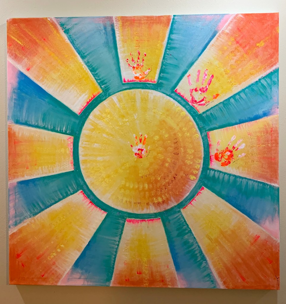 I have a thing for numbers. I always have. I don’t know why, but to me they are symbolic and carry meaning beyond their numeric value. I completed Big Sun today and added my and my children’s hand prints. When I wrote the date beside our print, the numbers 1.12.21 made me smile. In numerology I am an 11 and my dad, deceased, is a 22. I see this represented in the date. My dad’s birthday was December 21st. I also see this represented. So for me; my dad was present. I’ll take it.