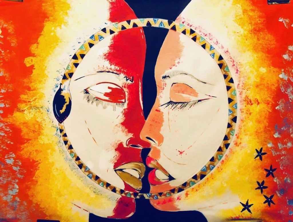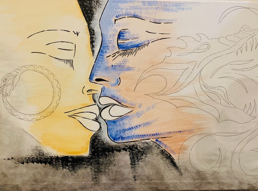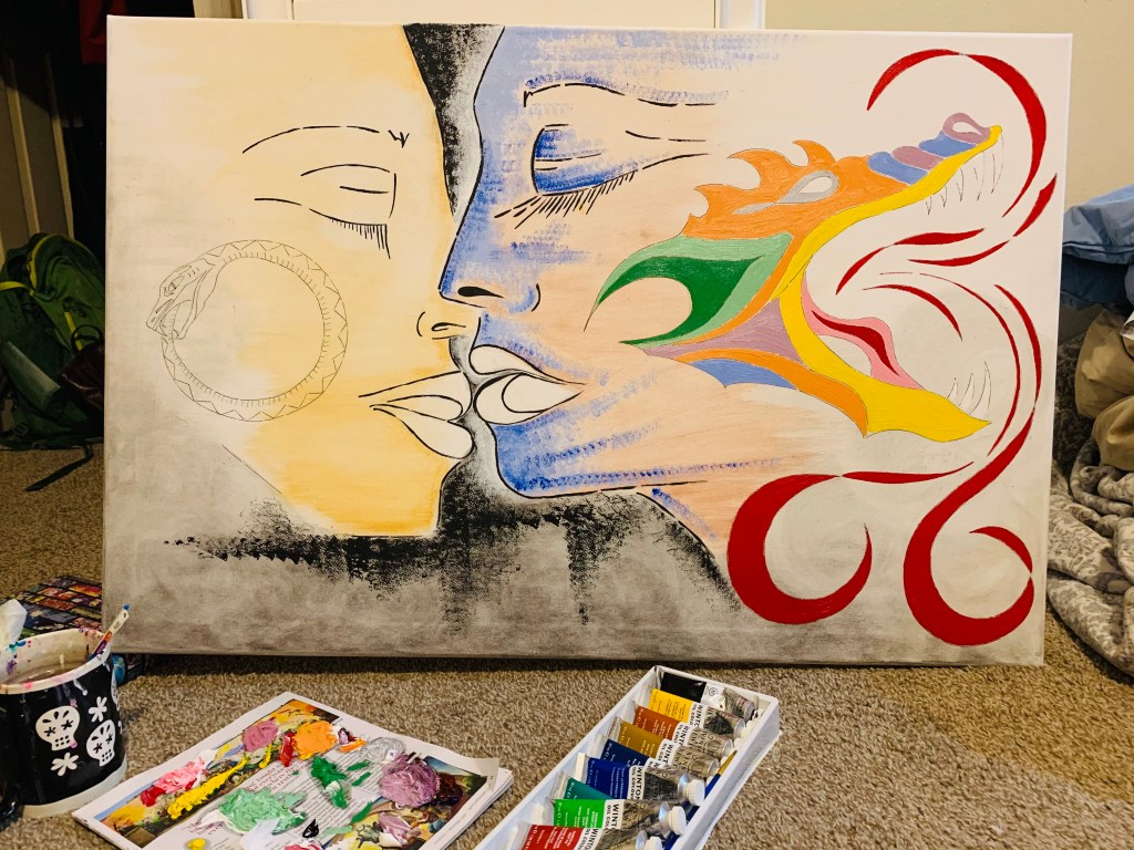 I started a drawing which is a remake of one I did in 2006 on the beach in PB. I lived in PB for almost the entirety of 2006 and I absolutely loved it. Sometimes I wonder if I wasn’t more at home there then I am here in the small northern Idaho town that I currently live in. I went back to visit PB (San Diego, California) in 2019 and it stirs up this cool energy/fire in me. It felt so good. I need to keep looking for that. Regardless, I did this kiss painting with two faces kissing in the center of a snake eating its tail. This is called the “ouroboros” and I thought meant Eternal Love. I labeled the painting Eternal Love and came up with the idea after seeing a card showing this tail eating snake in a small card shop. What was interesting about this painting, is that I hung on to it and displayed it at a small cafe when I first moved to Idaho. A couple in the 50s took great interest in it for their son Darcy’s wedding as a gift to their son and to his beautiful fiance, Amber. I wouldn’t sell it to them for two reasons: 1) I wasn’t selling my art at that time, I was learning and working through it and some pieces were sentimental for that reason; and 2) that piece was imperfect, on un-stretched canvas and I felt like it needed to more carefully recreated. I kept it and they moved on. I later met their son and his wife and they became friends of mine. Three years later, Darcy and Amber were tragically killed in a boating accident; both in their mid-thirties. I think about the painting; about eternal love. That painting is posted below. The drawing I am now working on is also the “ouroboros”, but I have since learned that the ourboros means not eternal love, but eternal renewal incorporating the cycle of life, death and rebirth. Interesting.